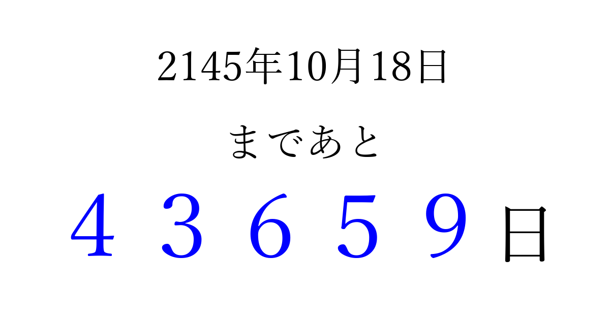 2145年10月18日(月)まで あと 99999 日です 追加すると、トップページからすぐ選べるようになります ※2026/04/06現在の結果です。 最新の状態に更新する ↓シェアして、タイムライン上にカウントダウンを表示しよう!↓ 📤 この結果を共有する Tweet シェア Threads Bluesky 別の日付でカウントダウン 2145年10月のカレンダー このページをブックマークに追加すると、いつでもカウントダウンを確認できます。 (PC: Ctrl+D / Mac: ⌘+D) hitome-notes.comでは以下のページも運営しています。 指定日と期間から日付を計算 | ガチャ確率計算・シミュレーション | プライバシー・ポリシー 運営者:Avocado