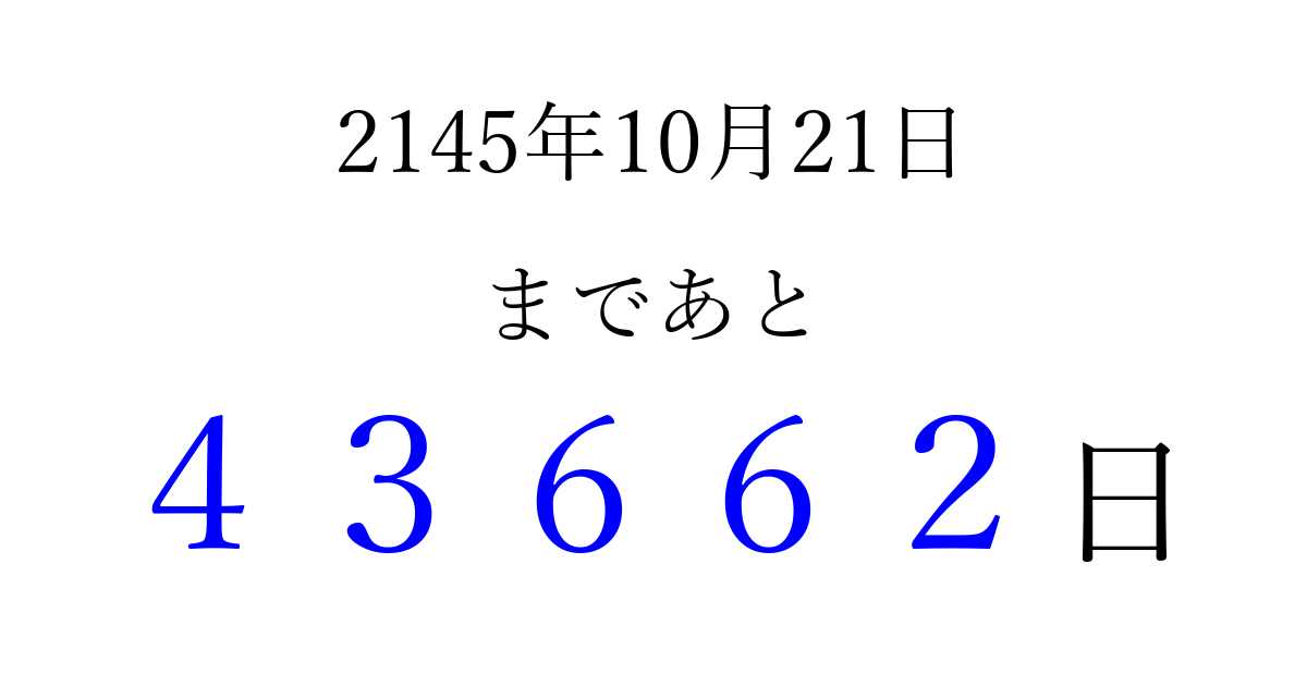 2145年10月21日(木)まで あと 99999 日です 追加すると、トップページからすぐ選べるようになります ※2026/04/06現在の結果です。 最新の状態に更新する ↓シェアして、タイムライン上にカウントダウンを表示しよう!↓ 📤 この結果を共有する Tweet シェア Threads Bluesky 別の日付でカウントダウン 2145年10月のカレンダー このページをブックマークに追加すると、いつでもカウントダウンを確認できます。 (PC: Ctrl+D / Mac: ⌘+D) hitome-notes.comでは以下のページも運営しています。 指定日と期間から日付を計算 | ガチャ確率計算・シミュレーション | プライバシー・ポリシー 運営者:Avocado