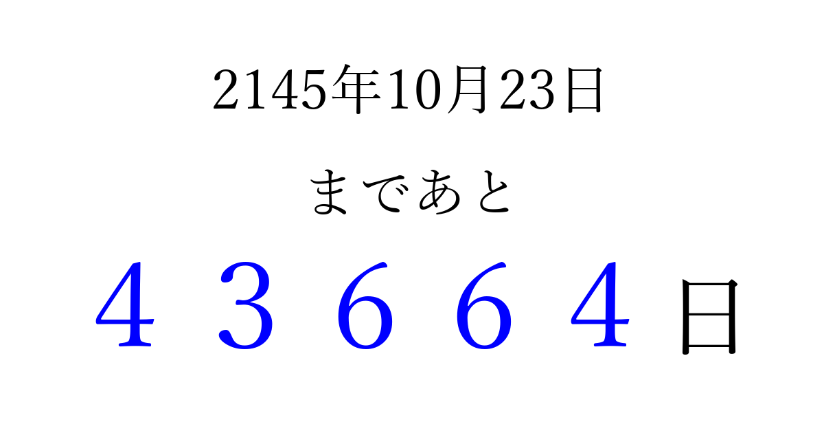2145年10月23日(土)まで あと 99999 日です 追加すると、トップページからすぐ選べるようになります ※2026/04/06現在の結果です。 最新の状態に更新する ↓シェアして、タイムライン上にカウントダウンを表示しよう!↓ 📤 この結果を共有する Tweet シェア Threads Bluesky 別の日付でカウントダウン 2145年10月のカレンダー このページをブックマークに追加すると、いつでもカウントダウンを確認できます。 (PC: Ctrl+D / Mac: ⌘+D) hitome-notes.comでは以下のページも運営しています。 指定日と期間から日付を計算 | ガチャ確率計算・シミュレーション | プライバシー・ポリシー 運営者:Avocado