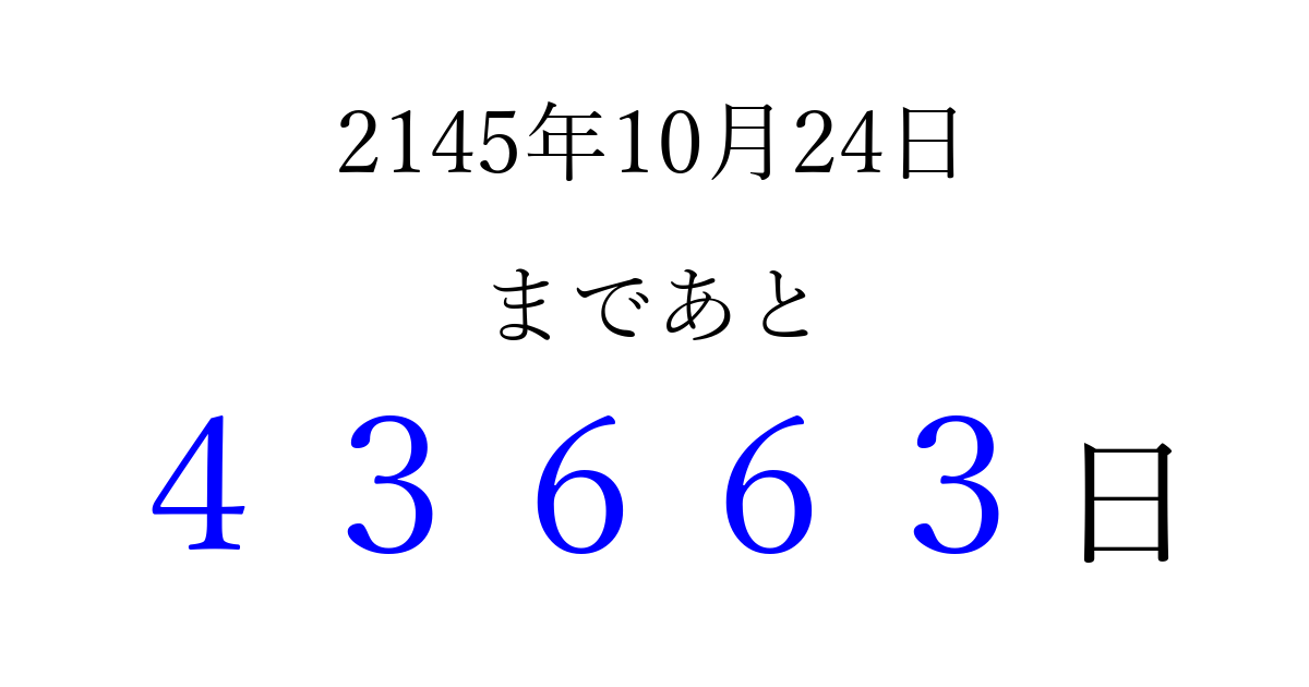 2145年10月24日(日)まで あと 99999 日です 追加すると、トップページからすぐ選べるようになります ※2026/04/08現在の結果です。 最新の状態に更新する ↓シェアして、タイムライン上にカウントダウンを表示しよう!↓ 📤 この結果を共有する Tweet シェア Threads Bluesky 別の日付でカウントダウン 2145年10月のカレンダー このページをブックマークに追加すると、いつでもカウントダウンを確認できます。 (PC: Ctrl+D / Mac: ⌘+D) hitome-notes.comでは以下のページも運営しています。 指定日と期間から日付を計算 | ガチャ確率計算・シミュレーション | プライバシー・ポリシー 運営者:Avocado