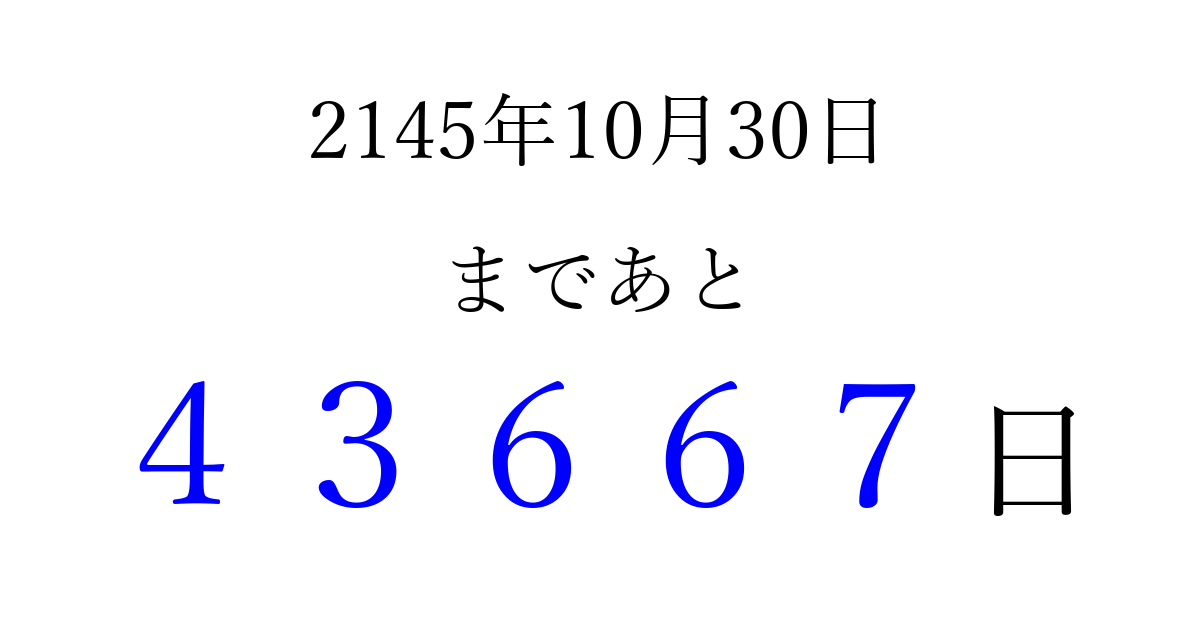 2145年10月30日(土)まで あと 99999 日です 追加すると、トップページからすぐ選べるようになります ※2026/04/10現在の結果です。 最新の状態に更新する ↓シェアして、タイムライン上にカウントダウンを表示しよう!↓ 📤 この結果を共有する Tweet シェア Threads Bluesky 別の日付でカウントダウン 2145年10月のカレンダー このページをブックマークに追加すると、いつでもカウントダウンを確認できます。 (PC: Ctrl+D / Mac: ⌘+D) hitome-notes.comでは以下のページも運営しています。 指定日と期間から日付を計算 | ガチャ確率計算・シミュレーション | プライバシー・ポリシー 運営者:Avocado