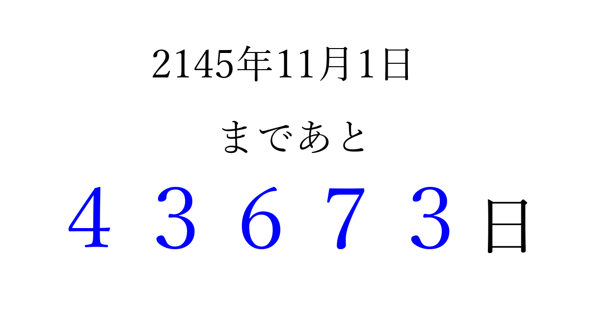 2145年11月1日(月)まで あと 99999 日です 追加すると、トップページからすぐ選べるようになります ※2026/04/06現在の結果です。 最新の状態に更新する ↓シェアして、タイムライン上にカウントダウンを表示しよう!↓ 📤 この結果を共有する Tweet シェア Threads Bluesky 別の日付でカウントダウン 2145年11月のカレンダー このページをブックマークに追加すると、いつでもカウントダウンを確認できます。 (PC: Ctrl+D / Mac: ⌘+D) hitome-notes.comでは以下のページも運営しています。 指定日と期間から日付を計算 | ガチャ確率計算・シミュレーション | プライバシー・ポリシー 運営者:Avocado