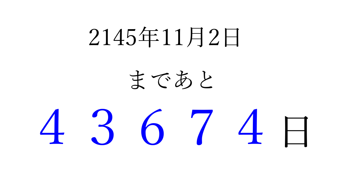 2145年11月2日(火)まで あと 99999 日です 追加すると、トップページからすぐ選べるようになります ※2026/04/06現在の結果です。 最新の状態に更新する ↓シェアして、タイムライン上にカウントダウンを表示しよう!↓ 📤 この結果を共有する Tweet シェア Threads Bluesky 別の日付でカウントダウン 2145年11月のカレンダー このページをブックマークに追加すると、いつでもカウントダウンを確認できます。 (PC: Ctrl+D / Mac: ⌘+D) hitome-notes.comでは以下のページも運営しています。 指定日と期間から日付を計算 | ガチャ確率計算・シミュレーション | プライバシー・ポリシー 運営者:Avocado