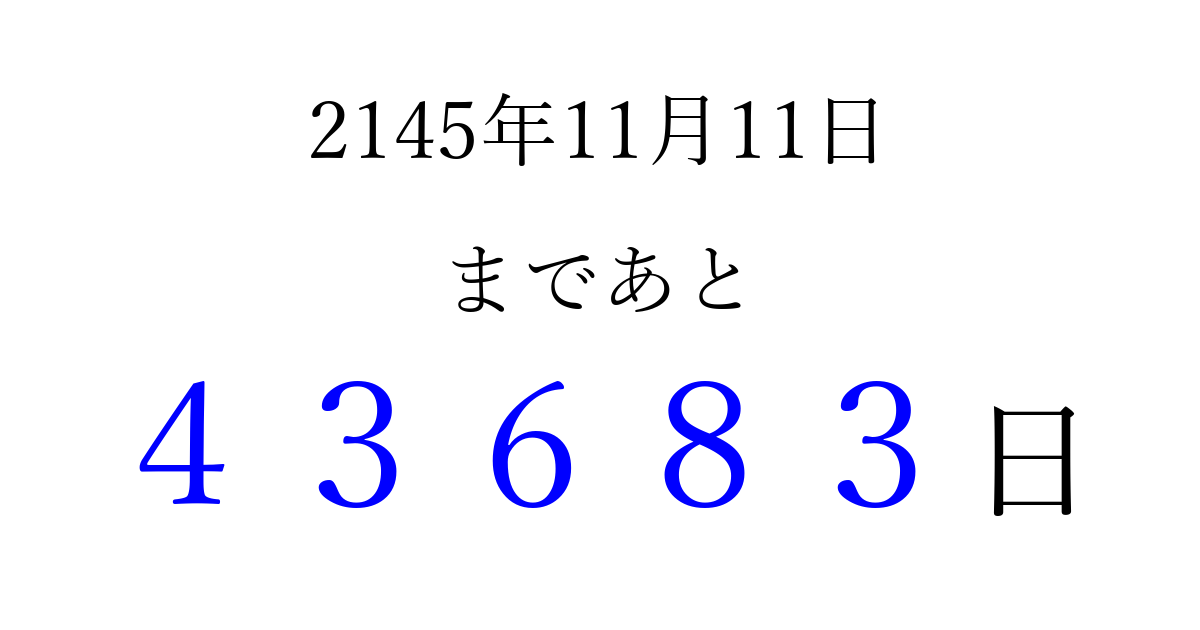 2145年11月11日(木)まで あと 99999 日です 追加すると、トップページからすぐ選べるようになります ※2026/04/06現在の結果です。 最新の状態に更新する ↓シェアして、タイムライン上にカウントダウンを表示しよう!↓ 📤 この結果を共有する Tweet シェア Threads Bluesky 別の日付でカウントダウン 2145年11月のカレンダー このページをブックマークに追加すると、いつでもカウントダウンを確認できます。 (PC: Ctrl+D / Mac: ⌘+D) hitome-notes.comでは以下のページも運営しています。 指定日と期間から日付を計算 | ガチャ確率計算・シミュレーション | プライバシー・ポリシー 運営者:Avocado