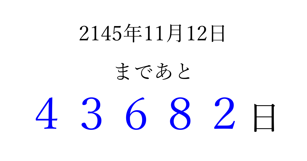 2145年11月12日(金)まで あと 99999 日です 追加すると、トップページからすぐ選べるようになります ※2026/04/08現在の結果です。 最新の状態に更新する ↓シェアして、タイムライン上にカウントダウンを表示しよう!↓ 📤 この結果を共有する Tweet シェア Threads Bluesky 別の日付でカウントダウン 2145年11月のカレンダー このページをブックマークに追加すると、いつでもカウントダウンを確認できます。 (PC: Ctrl+D / Mac: ⌘+D) hitome-notes.comでは以下のページも運営しています。 指定日と期間から日付を計算 | ガチャ確率計算・シミュレーション | プライバシー・ポリシー 運営者:Avocado