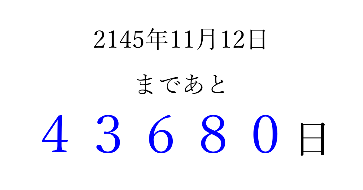 2145年11月12日(金)まで あと 99999 日です 追加すると、トップページからすぐ選べるようになります ※2026/04/10現在の結果です。 最新の状態に更新する ↓シェアして、タイムライン上にカウントダウンを表示しよう!↓ 📤 この結果を共有する Tweet シェア Threads Bluesky 別の日付でカウントダウン 2145年11月のカレンダー このページをブックマークに追加すると、いつでもカウントダウンを確認できます。 (PC: Ctrl+D / Mac: ⌘+D) hitome-notes.comでは以下のページも運営しています。 指定日と期間から日付を計算 | ガチャ確率計算・シミュレーション | プライバシー・ポリシー 運営者:Avocado