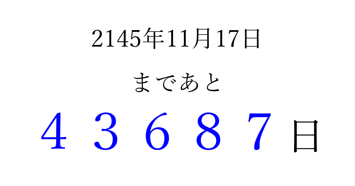 2145年11月17日(水)まで あと 99999 日です 追加すると、トップページからすぐ選べるようになります ※2026/04/08現在の結果です。 最新の状態に更新する ↓シェアして、タイムライン上にカウントダウンを表示しよう!↓ 📤 この結果を共有する Tweet シェア Threads Bluesky 別の日付でカウントダウン 2145年11月のカレンダー このページをブックマークに追加すると、いつでもカウントダウンを確認できます。 (PC: Ctrl+D / Mac: ⌘+D) hitome-notes.comでは以下のページも運営しています。 指定日と期間から日付を計算 | ガチャ確率計算・シミュレーション | プライバシー・ポリシー 運営者:Avocado