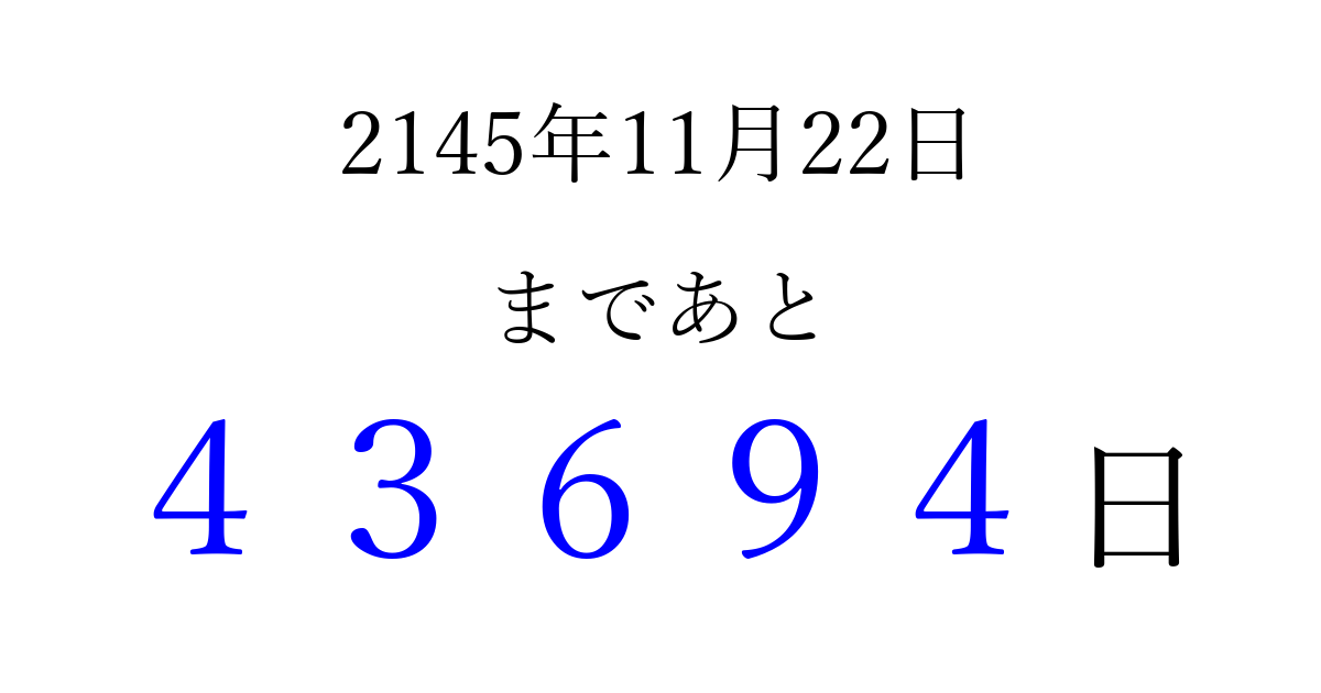 2145年11月22日(月)まで あと 99999 日です 追加すると、トップページからすぐ選べるようになります ※2026/04/06現在の結果です。 最新の状態に更新する ↓シェアして、タイムライン上にカウントダウンを表示しよう!↓ 📤 この結果を共有する Tweet シェア Threads Bluesky 別の日付でカウントダウン 2145年11月のカレンダー このページをブックマークに追加すると、いつでもカウントダウンを確認できます。 (PC: Ctrl+D / Mac: ⌘+D) hitome-notes.comでは以下のページも運営しています。 指定日と期間から日付を計算 | ガチャ確率計算・シミュレーション | プライバシー・ポリシー 運営者:Avocado