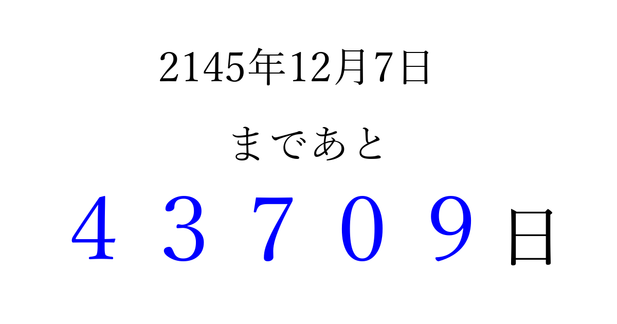 2145年12月7日(火)まで あと 99999 日です 追加すると、トップページからすぐ選べるようになります ※2026/04/06現在の結果です。 最新の状態に更新する ↓シェアして、タイムライン上にカウントダウンを表示しよう!↓ 📤 この結果を共有する Tweet シェア Threads Bluesky 別の日付でカウントダウン 2145年12月のカレンダー このページをブックマークに追加すると、いつでもカウントダウンを確認できます。 (PC: Ctrl+D / Mac: ⌘+D) hitome-notes.comでは以下のページも運営しています。 指定日と期間から日付を計算 | ガチャ確率計算・シミュレーション | プライバシー・ポリシー 運営者:Avocado