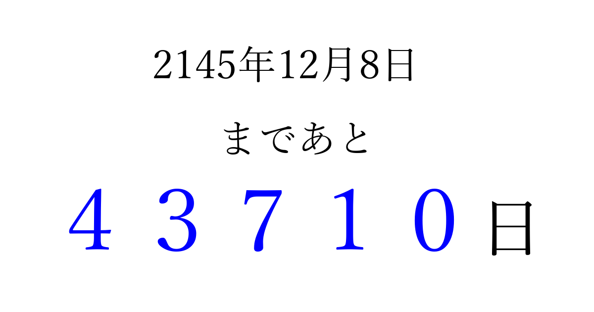 2145年12月8日(水)まで あと 99999 日です 追加すると、トップページからすぐ選べるようになります ※2026/04/06現在の結果です。 最新の状態に更新する ↓シェアして、タイムライン上にカウントダウンを表示しよう!↓ 📤 この結果を共有する Tweet シェア Threads Bluesky 別の日付でカウントダウン 2145年12月のカレンダー このページをブックマークに追加すると、いつでもカウントダウンを確認できます。 (PC: Ctrl+D / Mac: ⌘+D) hitome-notes.comでは以下のページも運営しています。 指定日と期間から日付を計算 | ガチャ確率計算・シミュレーション | プライバシー・ポリシー 運営者:Avocado