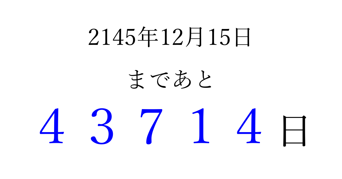 2145年12月15日(水)まで あと 99999 日です 追加すると、トップページからすぐ選べるようになります ※2026/04/09現在の結果です。 最新の状態に更新する ↓シェアして、タイムライン上にカウントダウンを表示しよう!↓ 📤 この結果を共有する Tweet シェア Threads Bluesky 別の日付でカウントダウン 2145年12月のカレンダー このページをブックマークに追加すると、いつでもカウントダウンを確認できます。 (PC: Ctrl+D / Mac: ⌘+D) hitome-notes.comでは以下のページも運営しています。 指定日と期間から日付を計算 | ガチャ確率計算・シミュレーション | プライバシー・ポリシー 運営者:Avocado