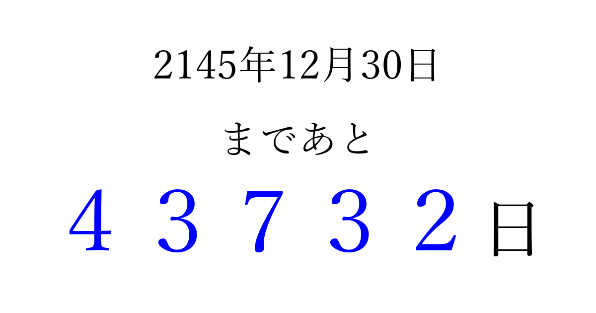 2145年12月30日(木)まで あと 99999 日です 追加すると、トップページからすぐ選べるようになります ※2026/04/06現在の結果です。 最新の状態に更新する ↓シェアして、タイムライン上にカウントダウンを表示しよう!↓ 📤 この結果を共有する Tweet シェア Threads Bluesky 別の日付でカウントダウン 2145年12月のカレンダー このページをブックマークに追加すると、いつでもカウントダウンを確認できます。 (PC: Ctrl+D / Mac: ⌘+D) hitome-notes.comでは以下のページも運営しています。 指定日と期間から日付を計算 | ガチャ確率計算・シミュレーション | プライバシー・ポリシー 運営者:Avocado