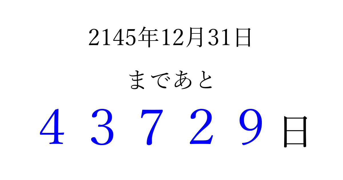 2145年12月31日(金)まで あと 99999 日です 追加すると、トップページからすぐ選べるようになります ※2026/04/10現在の結果です。 最新の状態に更新する ↓シェアして、タイムライン上にカウントダウンを表示しよう!↓ 📤 この結果を共有する Tweet シェア Threads Bluesky 別の日付でカウントダウン 2145年12月のカレンダー このページをブックマークに追加すると、いつでもカウントダウンを確認できます。 (PC: Ctrl+D / Mac: ⌘+D) hitome-notes.comでは以下のページも運営しています。 指定日と期間から日付を計算 | ガチャ確率計算・シミュレーション | プライバシー・ポリシー 運営者:Avocado
