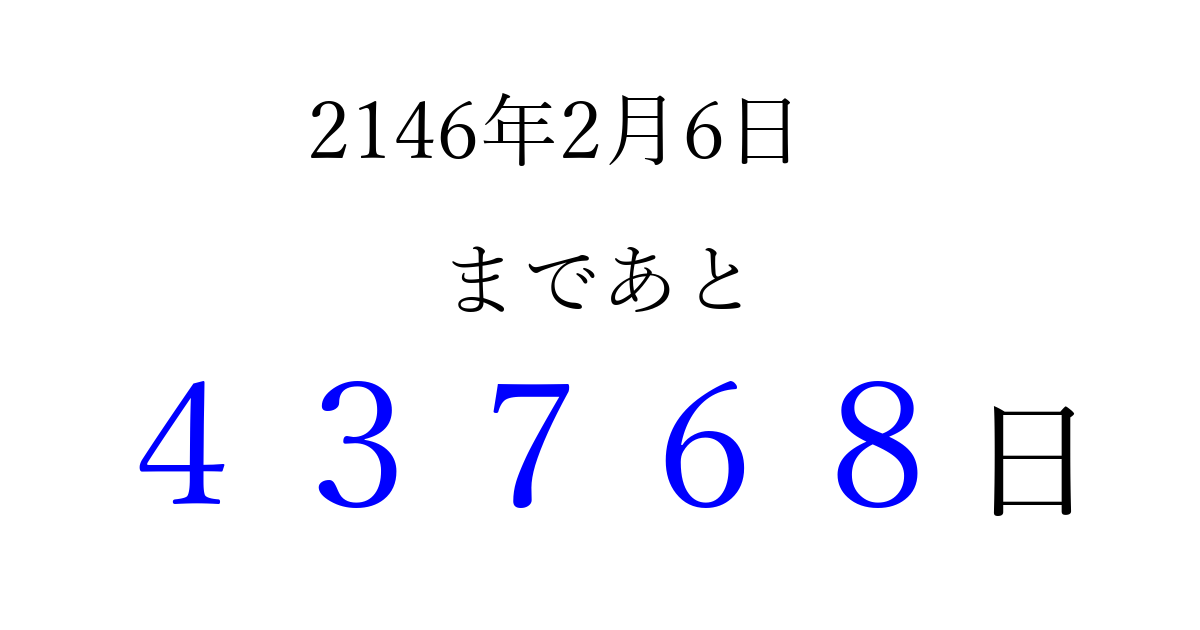 2146年2月6日(日)まで あと 99999 日です 追加すると、トップページからすぐ選べるようになります ※2026/04/08現在の結果です。 最新の状態に更新する ↓シェアして、タイムライン上にカウントダウンを表示しよう!↓ 📤 この結果を共有する Tweet シェア Threads Bluesky 別の日付でカウントダウン 2146年2月のカレンダー このページをブックマークに追加すると、いつでもカウントダウンを確認できます。 (PC: Ctrl+D / Mac: ⌘+D) hitome-notes.comでは以下のページも運営しています。 指定日と期間から日付を計算 | ガチャ確率計算・シミュレーション | プライバシー・ポリシー 運営者:Avocado