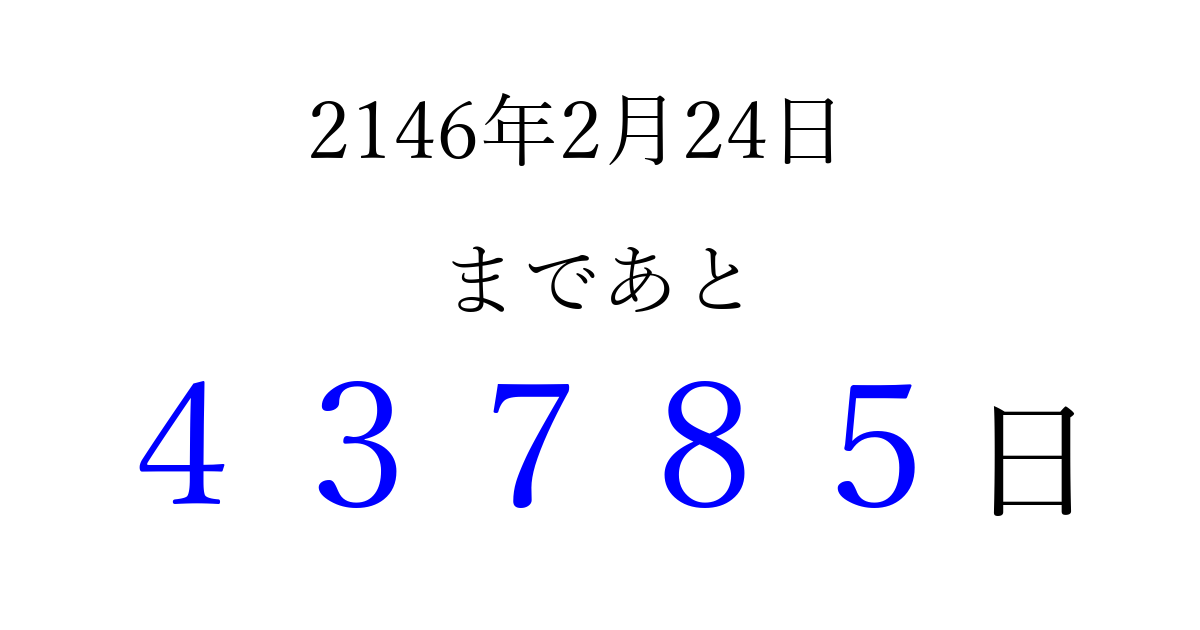 2146年2月24日(木)まで あと 99999 日です 追加すると、トップページからすぐ選べるようになります ※2026/04/09現在の結果です。 最新の状態に更新する ↓シェアして、タイムライン上にカウントダウンを表示しよう!↓ 📤 この結果を共有する Tweet シェア Threads Bluesky 別の日付でカウントダウン 2146年2月のカレンダー このページをブックマークに追加すると、いつでもカウントダウンを確認できます。 (PC: Ctrl+D / Mac: ⌘+D) hitome-notes.comでは以下のページも運営しています。 指定日と期間から日付を計算 | ガチャ確率計算・シミュレーション | プライバシー・ポリシー 運営者:Avocado