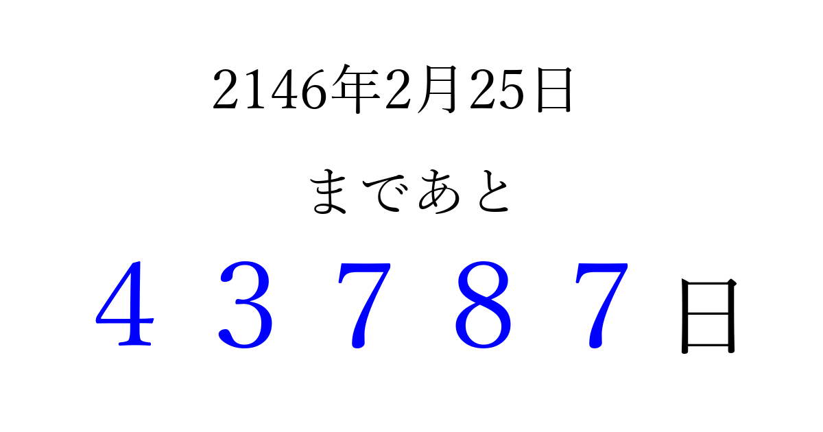 2146年2月25日(金)まで あと 99999 日です 追加すると、トップページからすぐ選べるようになります ※2026/04/08現在の結果です。 最新の状態に更新する ↓シェアして、タイムライン上にカウントダウンを表示しよう!↓ 📤 この結果を共有する Tweet シェア Threads Bluesky 別の日付でカウントダウン 2146年2月のカレンダー このページをブックマークに追加すると、いつでもカウントダウンを確認できます。 (PC: Ctrl+D / Mac: ⌘+D) hitome-notes.comでは以下のページも運営しています。 指定日と期間から日付を計算 | ガチャ確率計算・シミュレーション | プライバシー・ポリシー 運営者:Avocado