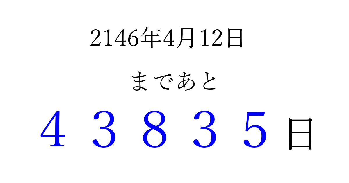 2146年4月12日(火)まで あと 99999 日です 追加すると、トップページからすぐ選べるようになります ※2026/04/06現在の結果です。 最新の状態に更新する ↓シェアして、タイムライン上にカウントダウンを表示しよう!↓ 📤 この結果を共有する Tweet シェア Threads Bluesky 別の日付でカウントダウン 2146年4月のカレンダー このページをブックマークに追加すると、いつでもカウントダウンを確認できます。 (PC: Ctrl+D / Mac: ⌘+D) hitome-notes.comでは以下のページも運営しています。 指定日と期間から日付を計算 | ガチャ確率計算・シミュレーション | プライバシー・ポリシー 運営者:Avocado