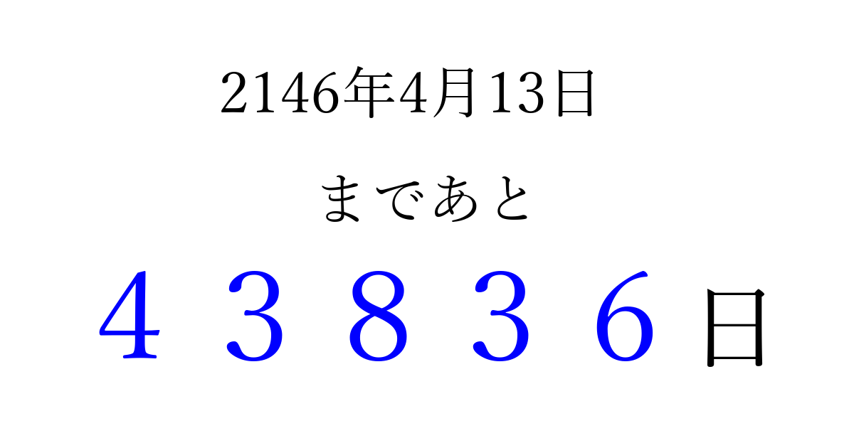 2146年4月13日(水)まで あと 99999 日です 追加すると、トップページからすぐ選べるようになります ※2026/04/06現在の結果です。 最新の状態に更新する ↓シェアして、タイムライン上にカウントダウンを表示しよう!↓ 📤 この結果を共有する Tweet シェア Threads Bluesky 別の日付でカウントダウン 2146年4月のカレンダー このページをブックマークに追加すると、いつでもカウントダウンを確認できます。 (PC: Ctrl+D / Mac: ⌘+D) hitome-notes.comでは以下のページも運営しています。 指定日と期間から日付を計算 | ガチャ確率計算・シミュレーション | プライバシー・ポリシー 運営者:Avocado