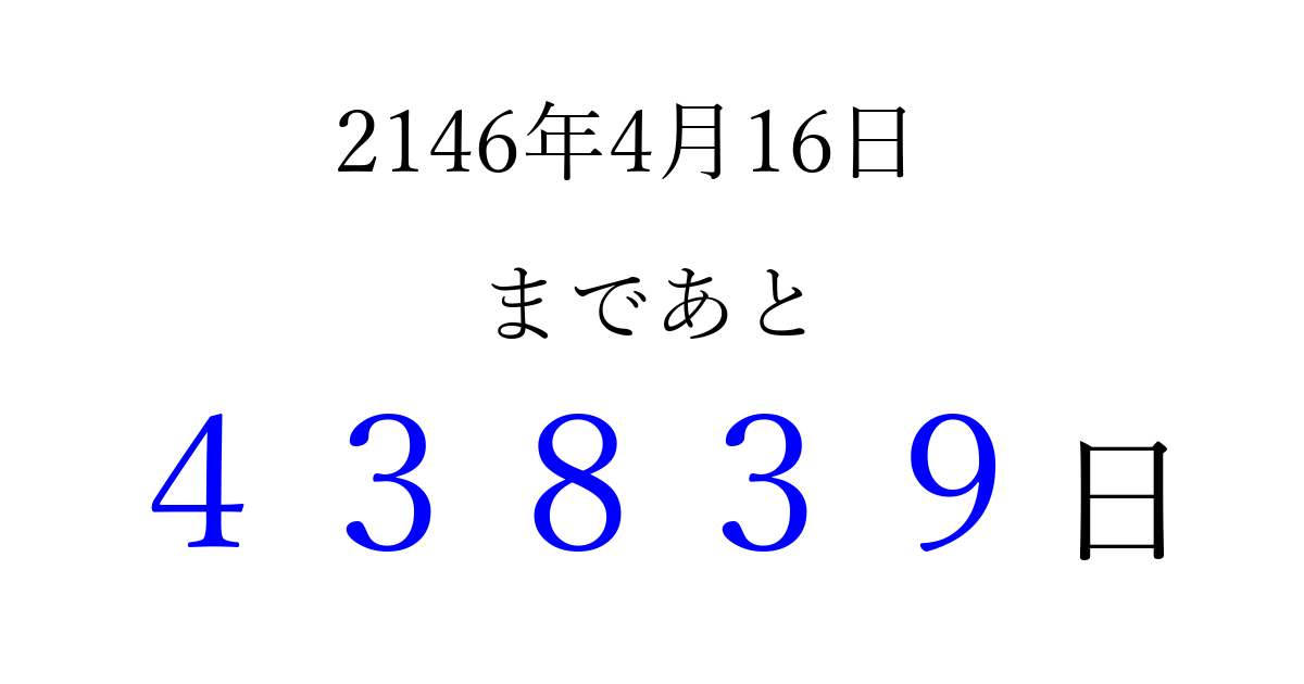 2146年4月16日(土)まで あと 99999 日です 追加すると、トップページからすぐ選べるようになります ※2026/04/06現在の結果です。 最新の状態に更新する ↓シェアして、タイムライン上にカウントダウンを表示しよう!↓ 📤 この結果を共有する Tweet シェア Threads Bluesky 別の日付でカウントダウン 2146年4月のカレンダー このページをブックマークに追加すると、いつでもカウントダウンを確認できます。 (PC: Ctrl+D / Mac: ⌘+D) hitome-notes.comでは以下のページも運営しています。 指定日と期間から日付を計算 | ガチャ確率計算・シミュレーション | プライバシー・ポリシー 運営者:Avocado
