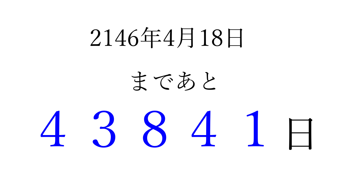 2146年4月18日(月)まで あと 99999 日です 追加すると、トップページからすぐ選べるようになります ※2026/04/06現在の結果です。 最新の状態に更新する ↓シェアして、タイムライン上にカウントダウンを表示しよう!↓ 📤 この結果を共有する Tweet シェア Threads Bluesky 別の日付でカウントダウン 2146年4月のカレンダー このページをブックマークに追加すると、いつでもカウントダウンを確認できます。 (PC: Ctrl+D / Mac: ⌘+D) hitome-notes.comでは以下のページも運営しています。 指定日と期間から日付を計算 | ガチャ確率計算・シミュレーション | プライバシー・ポリシー 運営者:Avocado