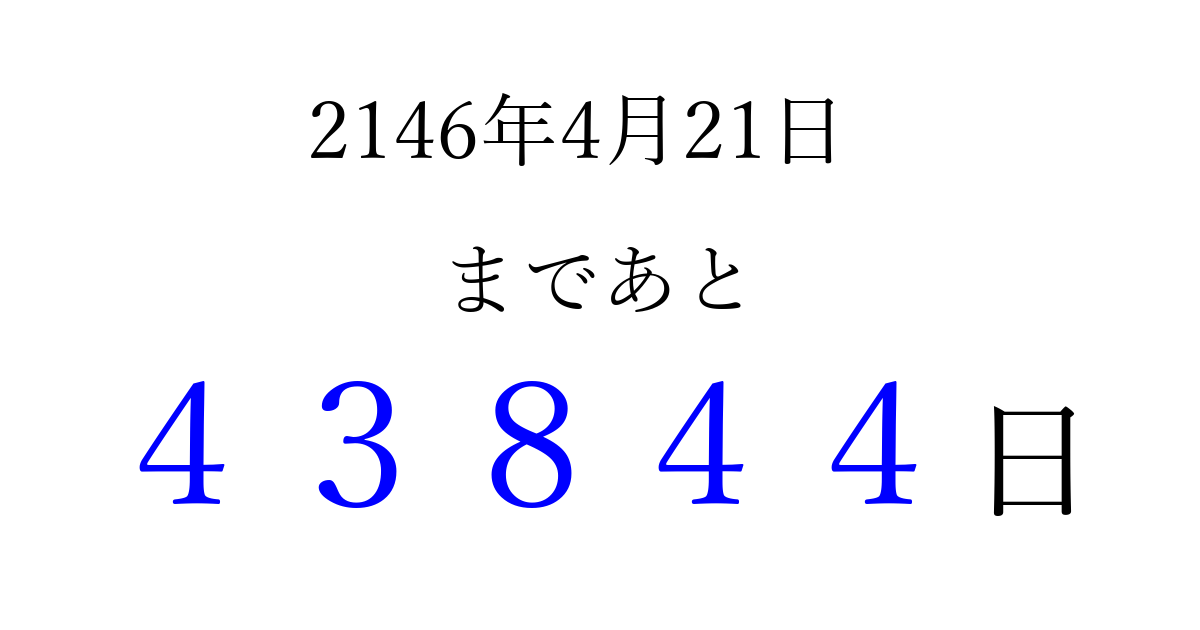 2146年4月21日(木)まで あと 99999 日です 追加すると、トップページからすぐ選べるようになります ※2026/04/06現在の結果です。 最新の状態に更新する ↓シェアして、タイムライン上にカウントダウンを表示しよう!↓ 📤 この結果を共有する Tweet シェア Threads Bluesky 別の日付でカウントダウン 2146年4月のカレンダー このページをブックマークに追加すると、いつでもカウントダウンを確認できます。 (PC: Ctrl+D / Mac: ⌘+D) hitome-notes.comでは以下のページも運営しています。 指定日と期間から日付を計算 | ガチャ確率計算・シミュレーション | プライバシー・ポリシー 運営者:Avocado