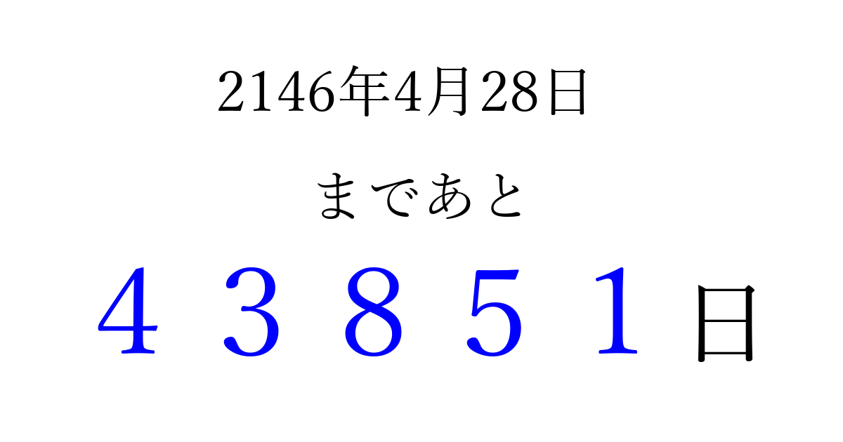 2146年4月28日(木)まで あと 99999 日です 追加すると、トップページからすぐ選べるようになります ※2026/04/06現在の結果です。 最新の状態に更新する ↓シェアして、タイムライン上にカウントダウンを表示しよう!↓ 📤 この結果を共有する Tweet シェア Threads Bluesky 別の日付でカウントダウン 2146年4月のカレンダー このページをブックマークに追加すると、いつでもカウントダウンを確認できます。 (PC: Ctrl+D / Mac: ⌘+D) hitome-notes.comでは以下のページも運営しています。 指定日と期間から日付を計算 | ガチャ確率計算・シミュレーション | プライバシー・ポリシー 運営者:Avocado
