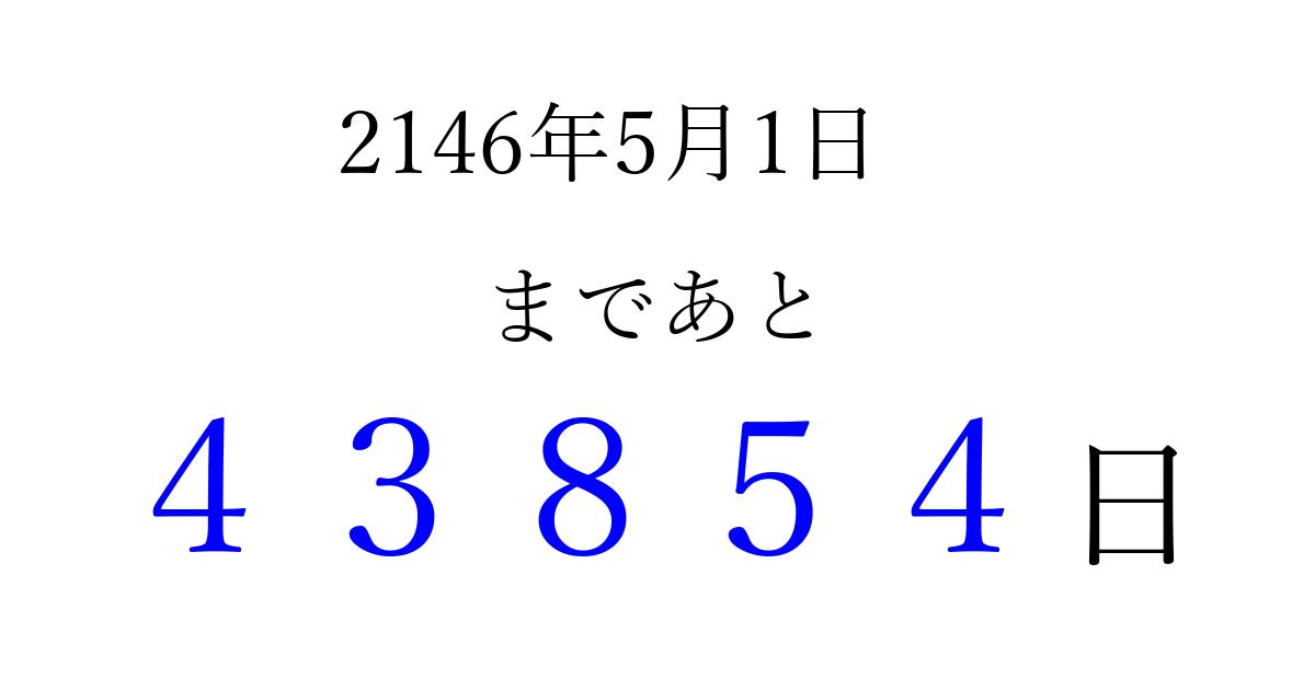 2146年5月1日(日)まで あと 99999 日です 追加すると、トップページからすぐ選べるようになります ※2026/04/06現在の結果です。 最新の状態に更新する ↓シェアして、タイムライン上にカウントダウンを表示しよう!↓ 📤 この結果を共有する Tweet シェア Threads Bluesky 別の日付でカウントダウン 2146年5月のカレンダー このページをブックマークに追加すると、いつでもカウントダウンを確認できます。 (PC: Ctrl+D / Mac: ⌘+D) hitome-notes.comでは以下のページも運営しています。 指定日と期間から日付を計算 | ガチャ確率計算・シミュレーション | プライバシー・ポリシー 運営者:Avocado