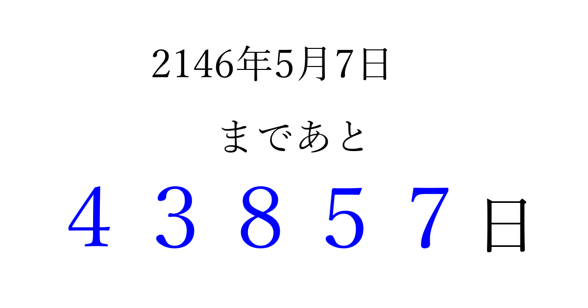 2146年5月7日(土)まで あと 99999 日です 追加すると、トップページからすぐ選べるようになります ※2026/04/09現在の結果です。 最新の状態に更新する ↓シェアして、タイムライン上にカウントダウンを表示しよう!↓ 📤 この結果を共有する Tweet シェア Threads Bluesky 別の日付でカウントダウン 2146年5月のカレンダー このページをブックマークに追加すると、いつでもカウントダウンを確認できます。 (PC: Ctrl+D / Mac: ⌘+D) hitome-notes.comでは以下のページも運営しています。 指定日と期間から日付を計算 | ガチャ確率計算・シミュレーション | プライバシー・ポリシー 運営者:Avocado