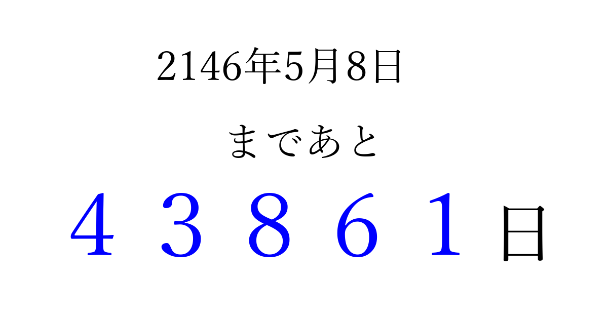 2146年5月8日(日)まで あと 99999 日です 追加すると、トップページからすぐ選べるようになります ※2026/04/06現在の結果です。 最新の状態に更新する ↓シェアして、タイムライン上にカウントダウンを表示しよう!↓ 📤 この結果を共有する Tweet シェア Threads Bluesky 別の日付でカウントダウン 2146年5月のカレンダー このページをブックマークに追加すると、いつでもカウントダウンを確認できます。 (PC: Ctrl+D / Mac: ⌘+D) hitome-notes.comでは以下のページも運営しています。 指定日と期間から日付を計算 | ガチャ確率計算・シミュレーション | プライバシー・ポリシー 運営者:Avocado