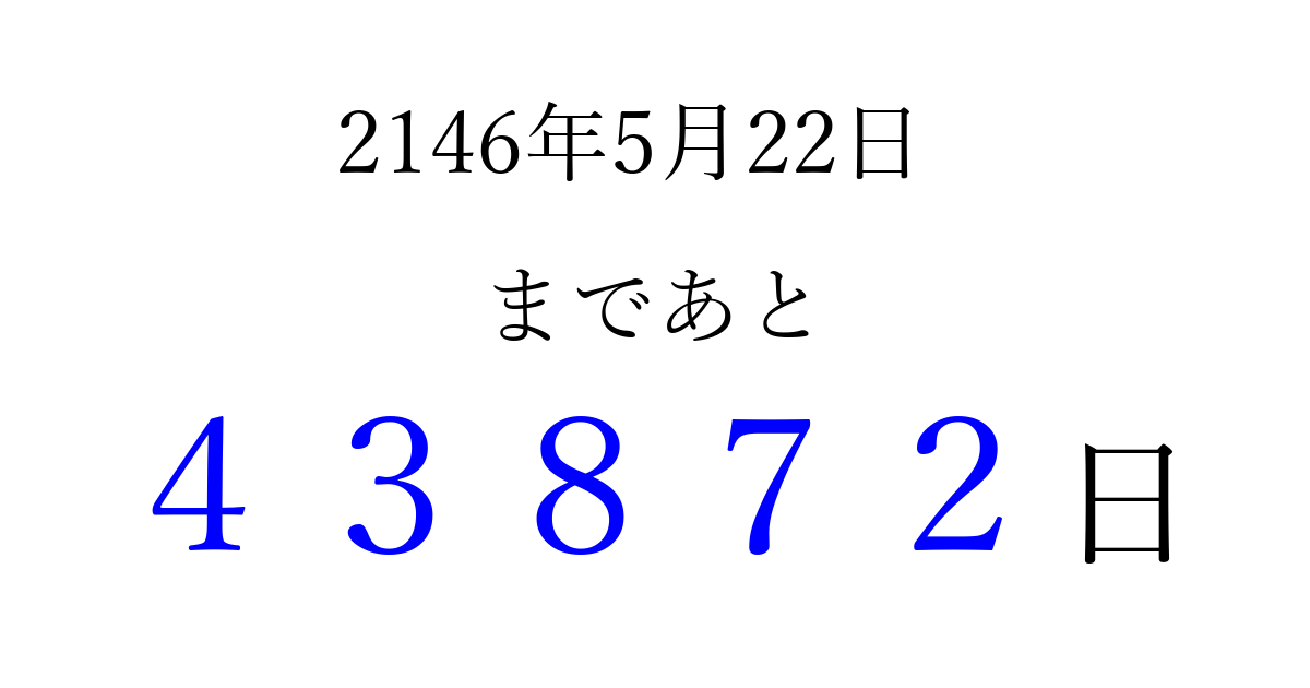 2146年5月22日(日)まで あと 99999 日です 追加すると、トップページからすぐ選べるようになります ※2026/04/09現在の結果です。 最新の状態に更新する ↓シェアして、タイムライン上にカウントダウンを表示しよう!↓ 📤 この結果を共有する Tweet シェア Threads Bluesky 別の日付でカウントダウン 2146年5月のカレンダー このページをブックマークに追加すると、いつでもカウントダウンを確認できます。 (PC: Ctrl+D / Mac: ⌘+D) hitome-notes.comでは以下のページも運営しています。 指定日と期間から日付を計算 | ガチャ確率計算・シミュレーション | プライバシー・ポリシー 運営者:Avocado