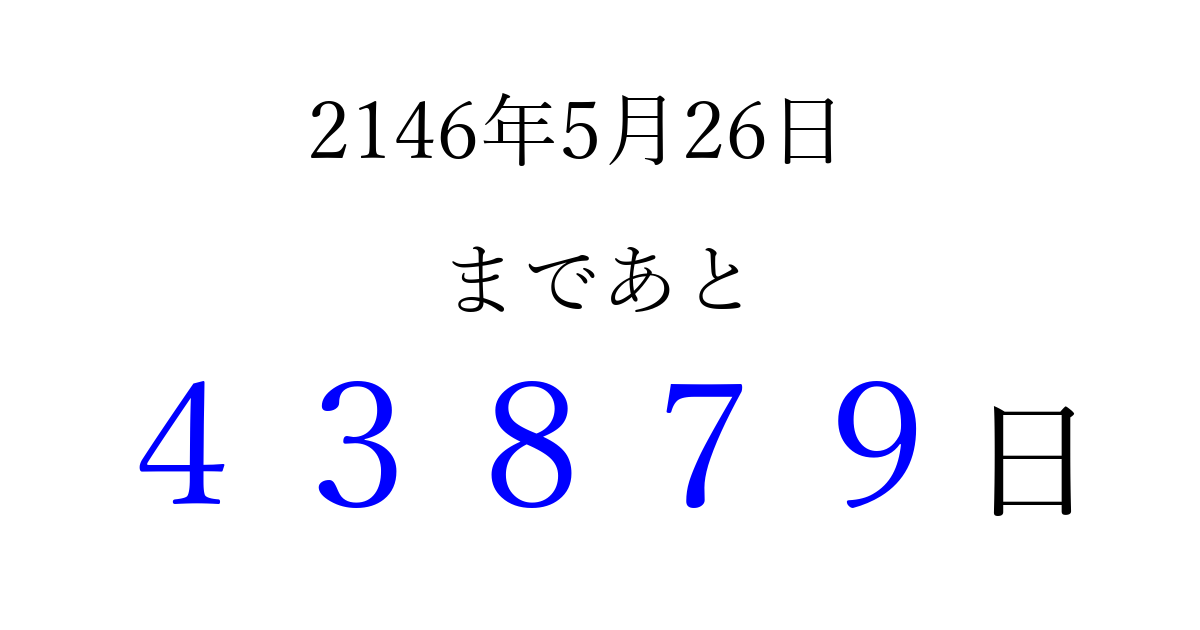 2146年5月26日(木)まで あと 99999 日です 追加すると、トップページからすぐ選べるようになります ※2026/04/06現在の結果です。 最新の状態に更新する ↓シェアして、タイムライン上にカウントダウンを表示しよう!↓ 📤 この結果を共有する Tweet シェア Threads Bluesky 別の日付でカウントダウン 2146年5月のカレンダー このページをブックマークに追加すると、いつでもカウントダウンを確認できます。 (PC: Ctrl+D / Mac: ⌘+D) hitome-notes.comでは以下のページも運営しています。 指定日と期間から日付を計算 | ガチャ確率計算・シミュレーション | プライバシー・ポリシー 運営者:Avocado