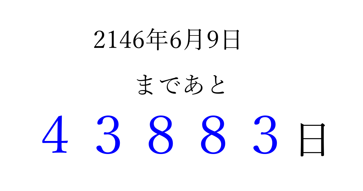 2146年6月9日(木)まで あと 99999 日です 追加すると、トップページからすぐ選べるようになります ※2026/04/16現在の結果です。 最新の状態に更新する ↓シェアして、タイムライン上にカウントダウンを表示しよう!↓ 📤 この結果を共有する Tweet シェア Threads Bluesky 別の日付でカウントダウン 2146年6月のカレンダー このページをブックマークに追加すると、いつでもカウントダウンを確認できます。 (PC: Ctrl+D / Mac: ⌘+D) hitome-notes.comでは以下のページも運営しています。 指定日と期間から日付を計算 | ガチャ確率計算・シミュレーション | プライバシー・ポリシー 運営者:Avocado