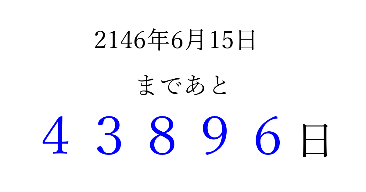 2146年6月15日(水)まで あと 99999 日です 追加すると、トップページからすぐ選べるようになります ※2026/04/09現在の結果です。 最新の状態に更新する ↓シェアして、タイムライン上にカウントダウンを表示しよう!↓ 📤 この結果を共有する Tweet シェア Threads Bluesky 別の日付でカウントダウン 2146年6月のカレンダー このページをブックマークに追加すると、いつでもカウントダウンを確認できます。 (PC: Ctrl+D / Mac: ⌘+D) hitome-notes.comでは以下のページも運営しています。 指定日と期間から日付を計算 | ガチャ確率計算・シミュレーション | プライバシー・ポリシー 運営者:Avocado