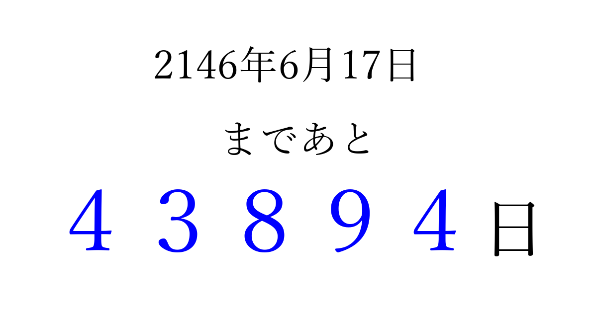 2146年6月17日(金)まで あと 99999 日です 追加すると、トップページからすぐ選べるようになります ※2026/04/13現在の結果です。 最新の状態に更新する ↓シェアして、タイムライン上にカウントダウンを表示しよう!↓ 📤 この結果を共有する Tweet シェア Threads Bluesky 別の日付でカウントダウン 2146年6月のカレンダー このページをブックマークに追加すると、いつでもカウントダウンを確認できます。 (PC: Ctrl+D / Mac: ⌘+D) hitome-notes.comでは以下のページも運営しています。 指定日と期間から日付を計算 | ガチャ確率計算・シミュレーション | プライバシー・ポリシー 運営者:Avocado