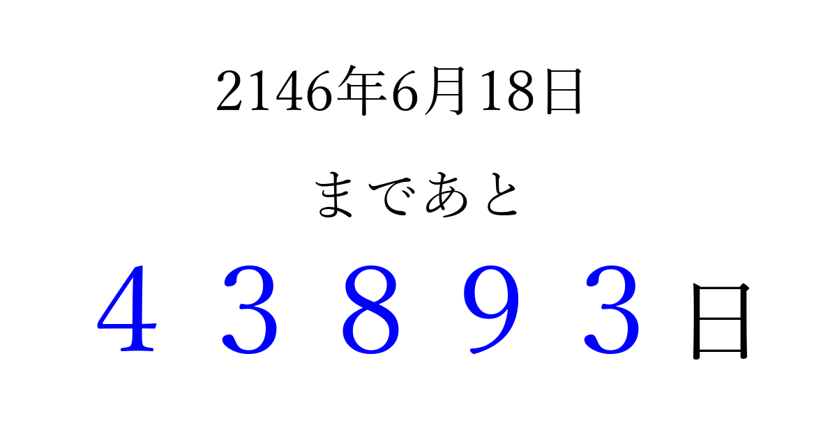 2146年6月18日(土)まで あと 99999 日です 追加すると、トップページからすぐ選べるようになります ※2026/04/15現在の結果です。 最新の状態に更新する ↓シェアして、タイムライン上にカウントダウンを表示しよう!↓ 📤 この結果を共有する Tweet シェア Threads Bluesky 別の日付でカウントダウン 2146年6月のカレンダー このページをブックマークに追加すると、いつでもカウントダウンを確認できます。 (PC: Ctrl+D / Mac: ⌘+D) hitome-notes.comでは以下のページも運営しています。 指定日と期間から日付を計算 | ガチャ確率計算・シミュレーション | プライバシー・ポリシー 運営者:Avocado