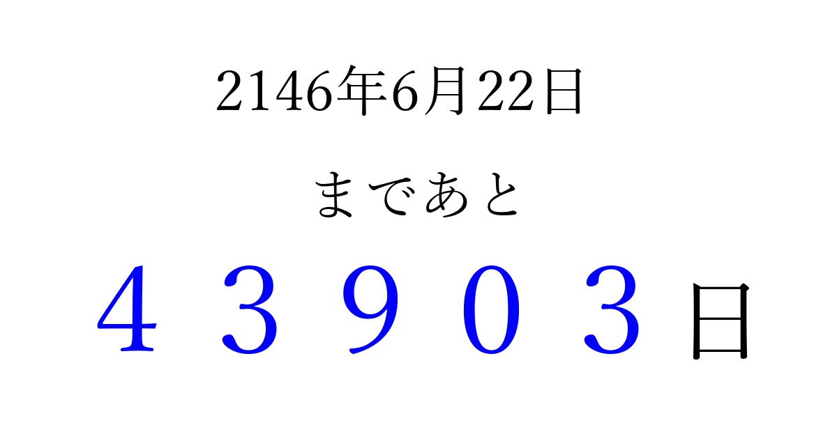 2146年6月22日(水)まで あと 99999 日です 追加すると、トップページからすぐ選べるようになります ※2026/04/09現在の結果です。 最新の状態に更新する ↓シェアして、タイムライン上にカウントダウンを表示しよう!↓ 📤 この結果を共有する Tweet シェア Threads Bluesky 別の日付でカウントダウン 2146年6月のカレンダー このページをブックマークに追加すると、いつでもカウントダウンを確認できます。 (PC: Ctrl+D / Mac: ⌘+D) hitome-notes.comでは以下のページも運営しています。 指定日と期間から日付を計算 | ガチャ確率計算・シミュレーション | プライバシー・ポリシー 運営者:Avocado