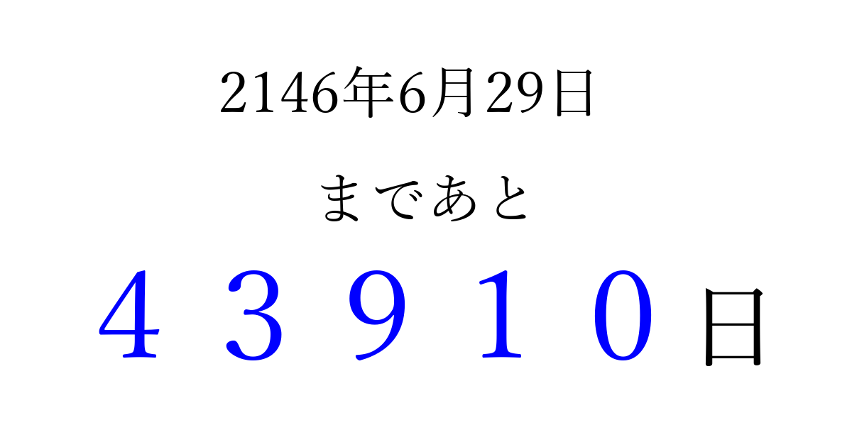 2146年6月29日(水)まで あと 99999 日です 追加すると、トップページからすぐ選べるようになります ※2026/04/09現在の結果です。 最新の状態に更新する ↓シェアして、タイムライン上にカウントダウンを表示しよう!↓ 📤 この結果を共有する Tweet シェア Threads Bluesky 別の日付でカウントダウン 2146年6月のカレンダー このページをブックマークに追加すると、いつでもカウントダウンを確認できます。 (PC: Ctrl+D / Mac: ⌘+D) hitome-notes.comでは以下のページも運営しています。 指定日と期間から日付を計算 | ガチャ確率計算・シミュレーション | プライバシー・ポリシー 運営者:Avocado