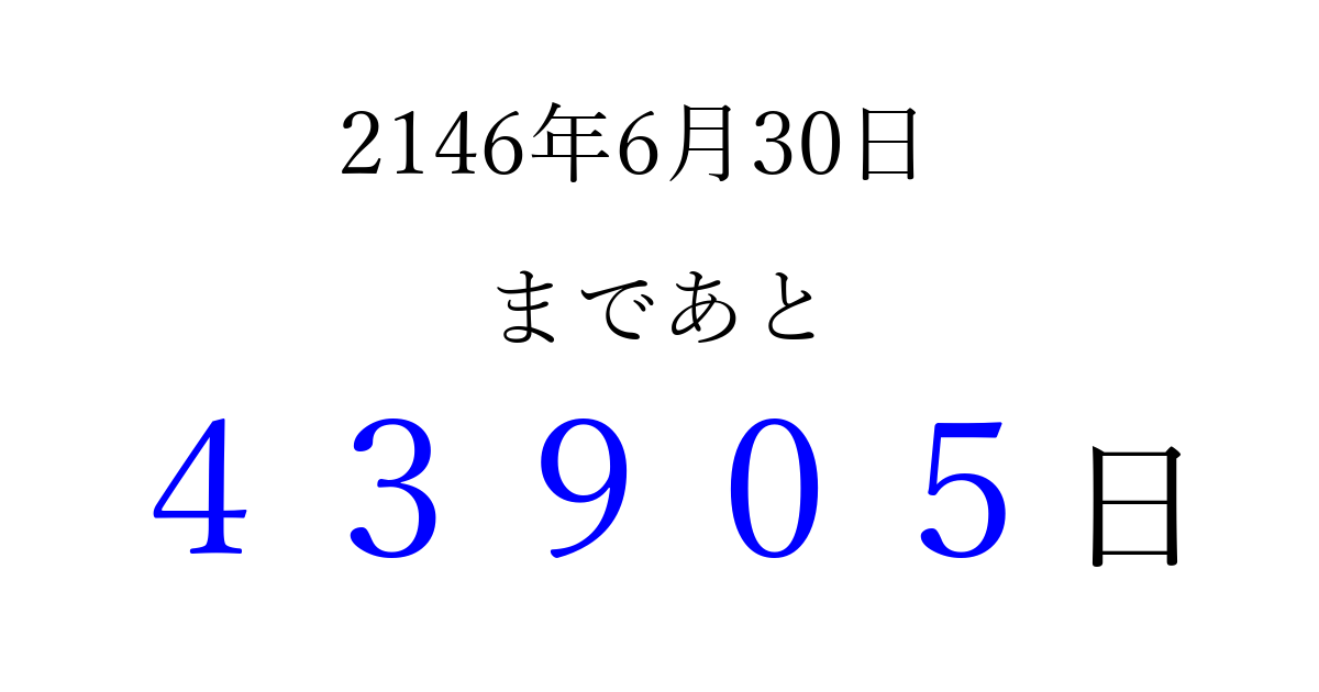 2146年6月30日(木)まで あと 99999 日です 追加すると、トップページからすぐ選べるようになります ※2026/04/15現在の結果です。 最新の状態に更新する ↓シェアして、タイムライン上にカウントダウンを表示しよう!↓ 📤 この結果を共有する Tweet シェア Threads Bluesky 別の日付でカウントダウン 2146年6月のカレンダー このページをブックマークに追加すると、いつでもカウントダウンを確認できます。 (PC: Ctrl+D / Mac: ⌘+D) hitome-notes.comでは以下のページも運営しています。 指定日と期間から日付を計算 | ガチャ確率計算・シミュレーション | プライバシー・ポリシー 運営者:Avocado
