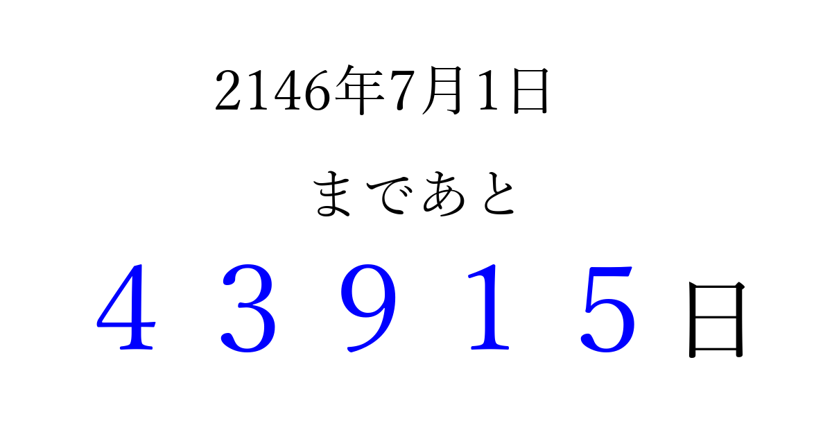 2146年7月1日(金)まで あと 99999 日です 追加すると、トップページからすぐ選べるようになります ※2026/04/06現在の結果です。 最新の状態に更新する ↓シェアして、タイムライン上にカウントダウンを表示しよう!↓ 📤 この結果を共有する Tweet シェア Threads Bluesky 別の日付でカウントダウン 2146年7月のカレンダー このページをブックマークに追加すると、いつでもカウントダウンを確認できます。 (PC: Ctrl+D / Mac: ⌘+D) hitome-notes.comでは以下のページも運営しています。 指定日と期間から日付を計算 | ガチャ確率計算・シミュレーション | プライバシー・ポリシー 運営者:Avocado