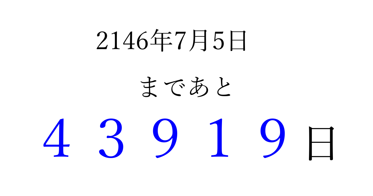 2146年7月5日(火)まで あと 99999 日です 追加すると、トップページからすぐ選べるようになります ※2026/04/06現在の結果です。 最新の状態に更新する ↓シェアして、タイムライン上にカウントダウンを表示しよう!↓ 📤 この結果を共有する Tweet シェア Threads Bluesky 別の日付でカウントダウン 2146年7月のカレンダー このページをブックマークに追加すると、いつでもカウントダウンを確認できます。 (PC: Ctrl+D / Mac: ⌘+D) hitome-notes.comでは以下のページも運営しています。 指定日と期間から日付を計算 | ガチャ確率計算・シミュレーション | プライバシー・ポリシー 運営者:Avocado