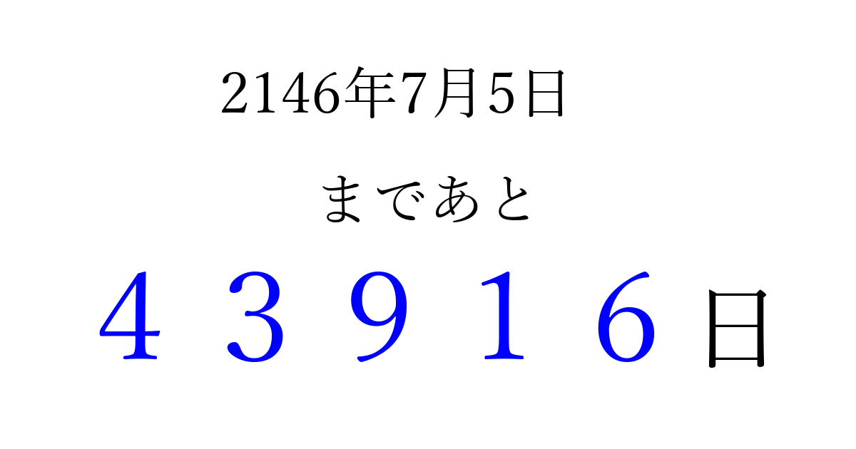 2146年7月5日(火)まで あと 99999 日です 追加すると、トップページからすぐ選べるようになります ※2026/04/09現在の結果です。 最新の状態に更新する ↓シェアして、タイムライン上にカウントダウンを表示しよう!↓ 📤 この結果を共有する Tweet シェア Threads Bluesky 別の日付でカウントダウン 2146年7月のカレンダー このページをブックマークに追加すると、いつでもカウントダウンを確認できます。 (PC: Ctrl+D / Mac: ⌘+D) hitome-notes.comでは以下のページも運営しています。 指定日と期間から日付を計算 | ガチャ確率計算・シミュレーション | プライバシー・ポリシー 運営者:Avocado