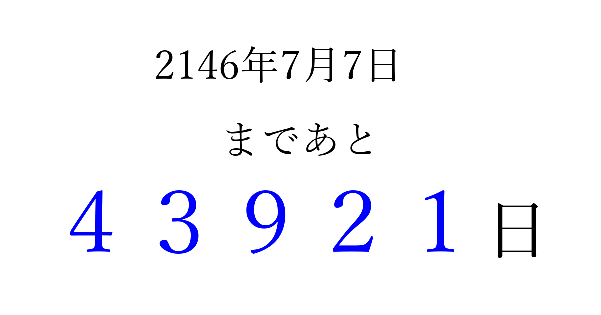 2146年7月7日(木)まで あと 99999 日です 追加すると、トップページからすぐ選べるようになります ※2026/04/06現在の結果です。 最新の状態に更新する ↓シェアして、タイムライン上にカウントダウンを表示しよう!↓ 📤 この結果を共有する Tweet シェア Threads Bluesky 別の日付でカウントダウン 2146年7月のカレンダー このページをブックマークに追加すると、いつでもカウントダウンを確認できます。 (PC: Ctrl+D / Mac: ⌘+D) hitome-notes.comでは以下のページも運営しています。 指定日と期間から日付を計算 | ガチャ確率計算・シミュレーション | プライバシー・ポリシー 運営者:Avocado