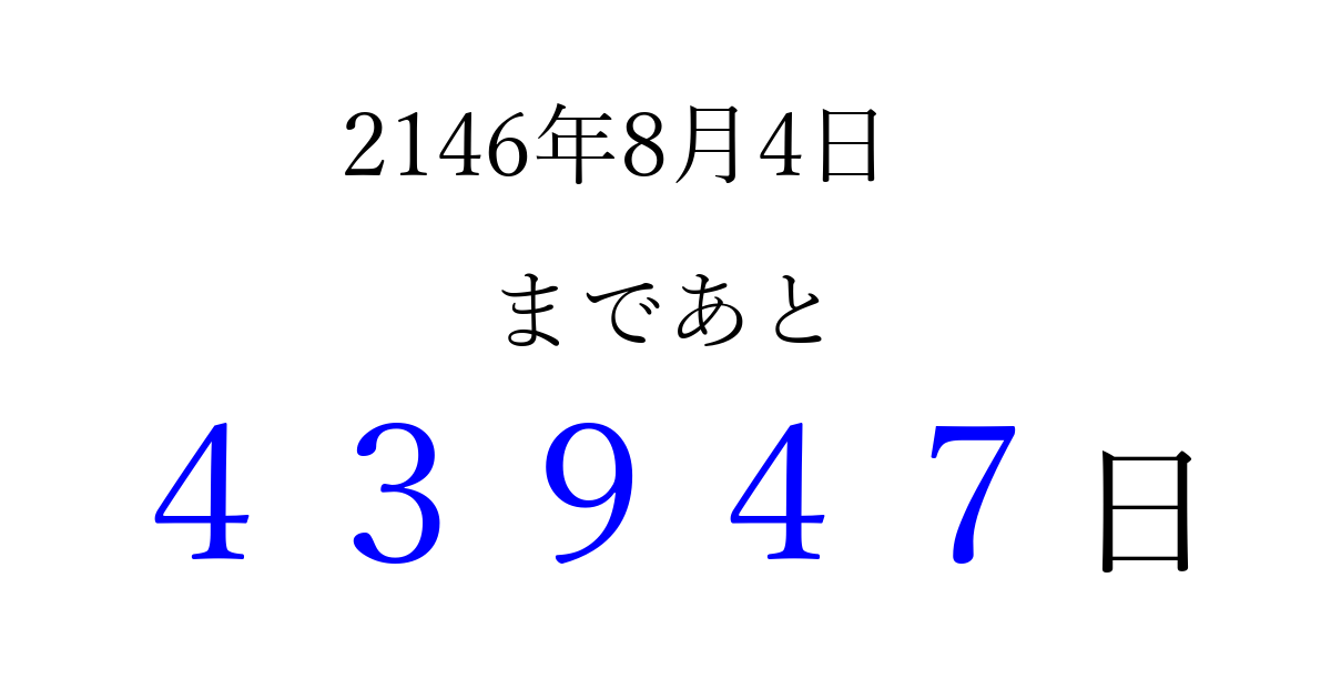 2146年8月4日(木)まで あと 99999 日です 追加すると、トップページからすぐ選べるようになります ※2026/04/08現在の結果です。 最新の状態に更新する ↓シェアして、タイムライン上にカウントダウンを表示しよう!↓ 📤 この結果を共有する Tweet シェア Threads Bluesky 別の日付でカウントダウン 2146年8月のカレンダー このページをブックマークに追加すると、いつでもカウントダウンを確認できます。 (PC: Ctrl+D / Mac: ⌘+D) hitome-notes.comでは以下のページも運営しています。 指定日と期間から日付を計算 | ガチャ確率計算・シミュレーション | プライバシー・ポリシー 運営者:Avocado