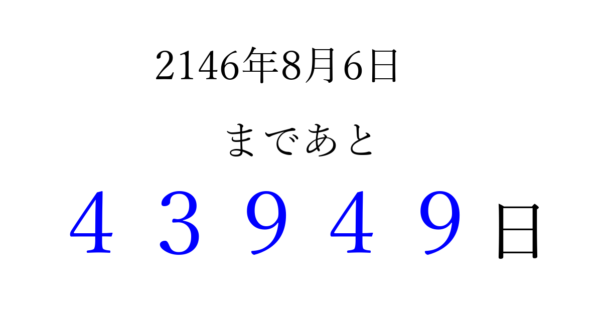 2146年8月6日(土)まで あと 99999 日です 追加すると、トップページからすぐ選べるようになります ※2026/04/08現在の結果です。 最新の状態に更新する ↓シェアして、タイムライン上にカウントダウンを表示しよう!↓ 📤 この結果を共有する Tweet シェア Threads Bluesky 別の日付でカウントダウン 2146年8月のカレンダー このページをブックマークに追加すると、いつでもカウントダウンを確認できます。 (PC: Ctrl+D / Mac: ⌘+D) hitome-notes.comでは以下のページも運営しています。 指定日と期間から日付を計算 | ガチャ確率計算・シミュレーション | プライバシー・ポリシー 運営者:Avocado