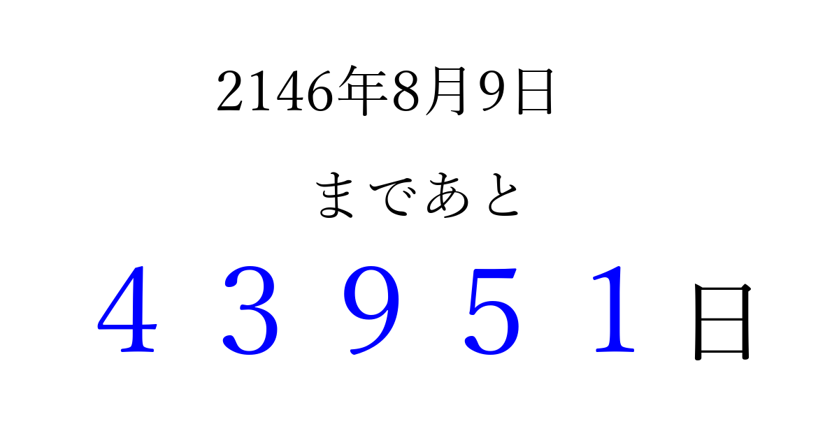 2146年8月9日(火)まで あと 99999 日です 追加すると、トップページからすぐ選べるようになります ※2026/04/09現在の結果です。 最新の状態に更新する ↓シェアして、タイムライン上にカウントダウンを表示しよう!↓ 📤 この結果を共有する Tweet シェア Threads Bluesky 別の日付でカウントダウン 2146年8月のカレンダー このページをブックマークに追加すると、いつでもカウントダウンを確認できます。 (PC: Ctrl+D / Mac: ⌘+D) hitome-notes.comでは以下のページも運営しています。 指定日と期間から日付を計算 | ガチャ確率計算・シミュレーション | プライバシー・ポリシー 運営者:Avocado