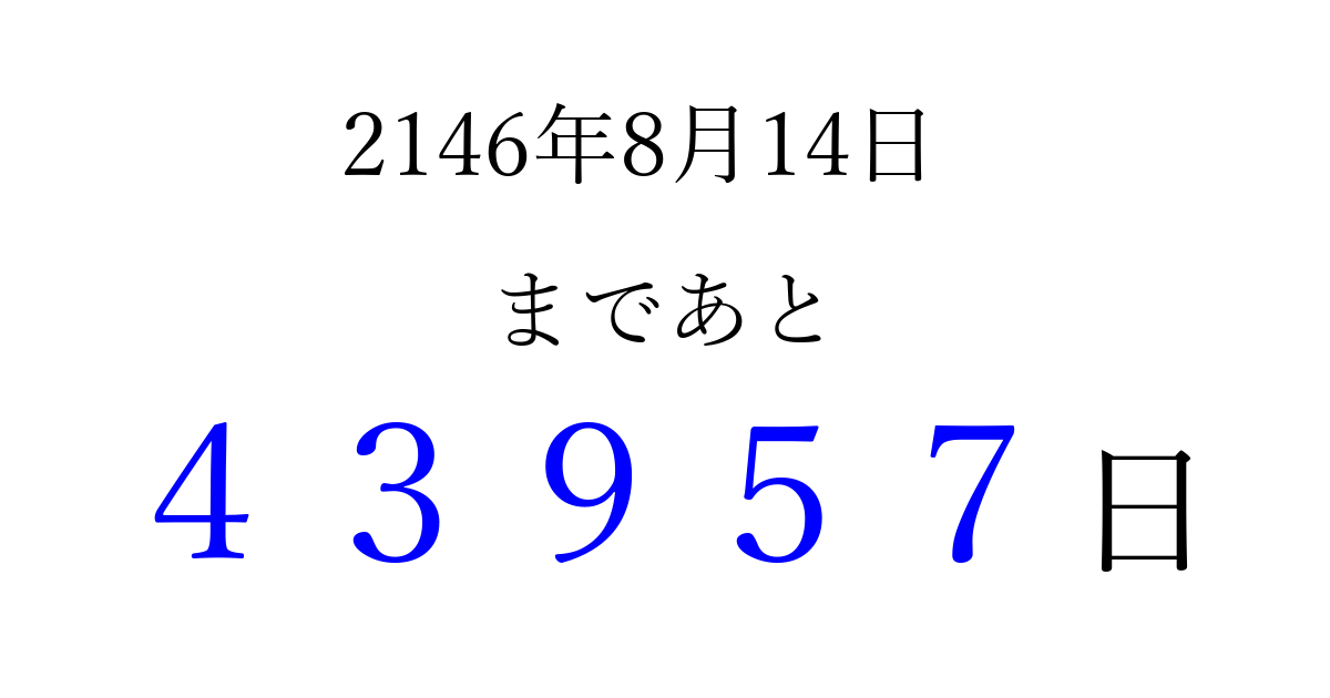 2146年8月14日(日)まで あと 99999 日です 追加すると、トップページからすぐ選べるようになります ※2026/04/08現在の結果です。 最新の状態に更新する ↓シェアして、タイムライン上にカウントダウンを表示しよう!↓ 📤 この結果を共有する Tweet シェア Threads Bluesky 別の日付でカウントダウン 2146年8月のカレンダー このページをブックマークに追加すると、いつでもカウントダウンを確認できます。 (PC: Ctrl+D / Mac: ⌘+D) hitome-notes.comでは以下のページも運営しています。 指定日と期間から日付を計算 | ガチャ確率計算・シミュレーション | プライバシー・ポリシー 運営者:Avocado