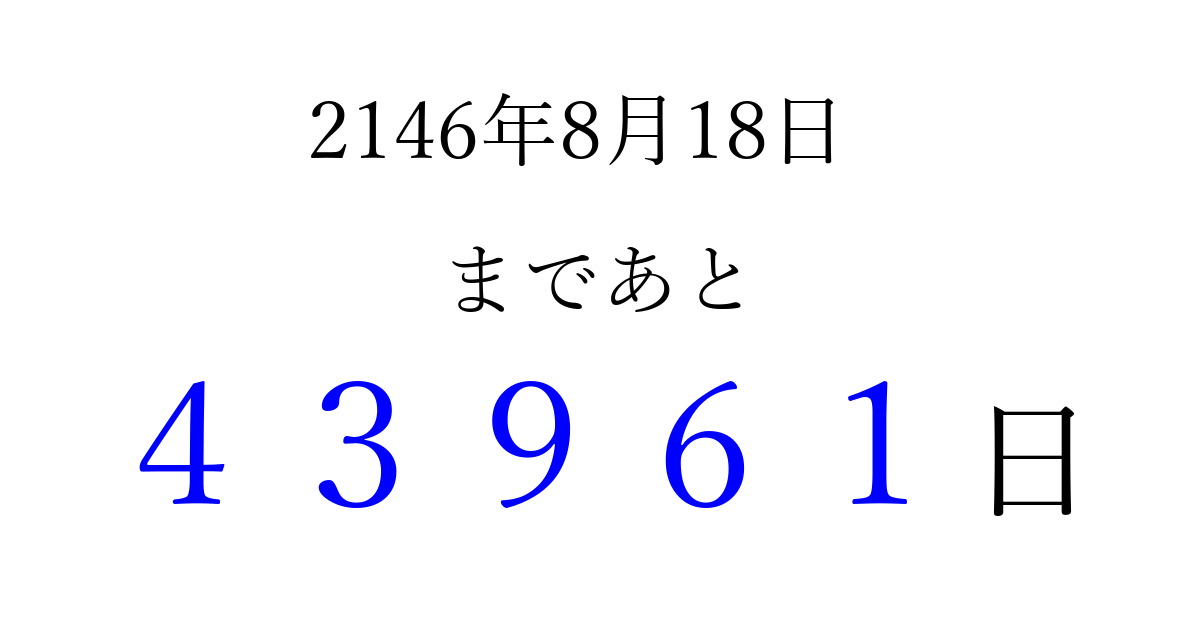 2146年8月18日(木)まで あと 99999 日です 追加すると、トップページからすぐ選べるようになります ※2026/04/08現在の結果です。 最新の状態に更新する ↓シェアして、タイムライン上にカウントダウンを表示しよう!↓ 📤 この結果を共有する Tweet シェア Threads Bluesky 別の日付でカウントダウン 2146年8月のカレンダー このページをブックマークに追加すると、いつでもカウントダウンを確認できます。 (PC: Ctrl+D / Mac: ⌘+D) hitome-notes.comでは以下のページも運営しています。 指定日と期間から日付を計算 | ガチャ確率計算・シミュレーション | プライバシー・ポリシー 運営者:Avocado