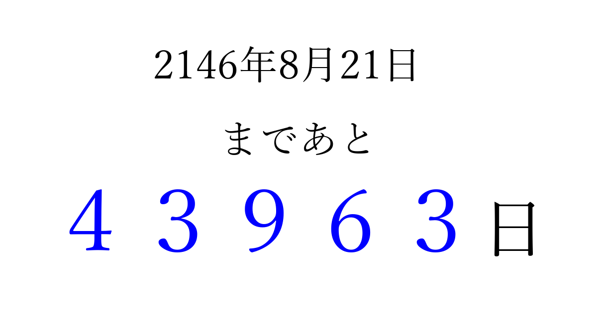 2146年8月21日(日)まで あと 99999 日です 追加すると、トップページからすぐ選べるようになります ※2026/04/09現在の結果です。 最新の状態に更新する ↓シェアして、タイムライン上にカウントダウンを表示しよう!↓ 📤 この結果を共有する Tweet シェア Threads Bluesky 別の日付でカウントダウン 2146年8月のカレンダー このページをブックマークに追加すると、いつでもカウントダウンを確認できます。 (PC: Ctrl+D / Mac: ⌘+D) hitome-notes.comでは以下のページも運営しています。 指定日と期間から日付を計算 | ガチャ確率計算・シミュレーション | プライバシー・ポリシー 運営者:Avocado