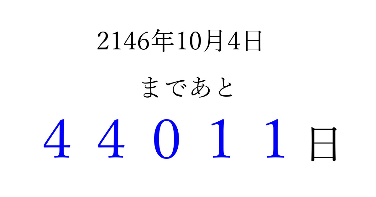 2146年10月4日(火)まで あと 99999 日です 追加すると、トップページからすぐ選べるようになります ※2026/04/05現在の結果です。 最新の状態に更新する ↓シェアして、タイムライン上にカウントダウンを表示しよう!↓ 📤 この結果を共有する Tweet シェア Threads Bluesky 別の日付でカウントダウン 2146年10月のカレンダー このページをブックマークに追加すると、いつでもカウントダウンを確認できます。 (PC: Ctrl+D / Mac: ⌘+D) hitome-notes.comでは以下のページも運営しています。 指定日と期間から日付を計算 | ガチャ確率計算・シミュレーション | プライバシー・ポリシー 運営者:Avocado