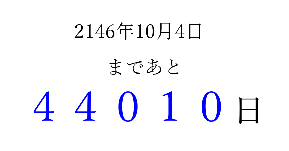 2146年10月4日(火)まで あと 99999 日です 追加すると、トップページからすぐ選べるようになります ※2026/04/06現在の結果です。 最新の状態に更新する ↓シェアして、タイムライン上にカウントダウンを表示しよう!↓ 📤 この結果を共有する Tweet シェア Threads Bluesky 別の日付でカウントダウン 2146年10月のカレンダー このページをブックマークに追加すると、いつでもカウントダウンを確認できます。 (PC: Ctrl+D / Mac: ⌘+D) hitome-notes.comでは以下のページも運営しています。 指定日と期間から日付を計算 | ガチャ確率計算・シミュレーション | プライバシー・ポリシー 運営者:Avocado